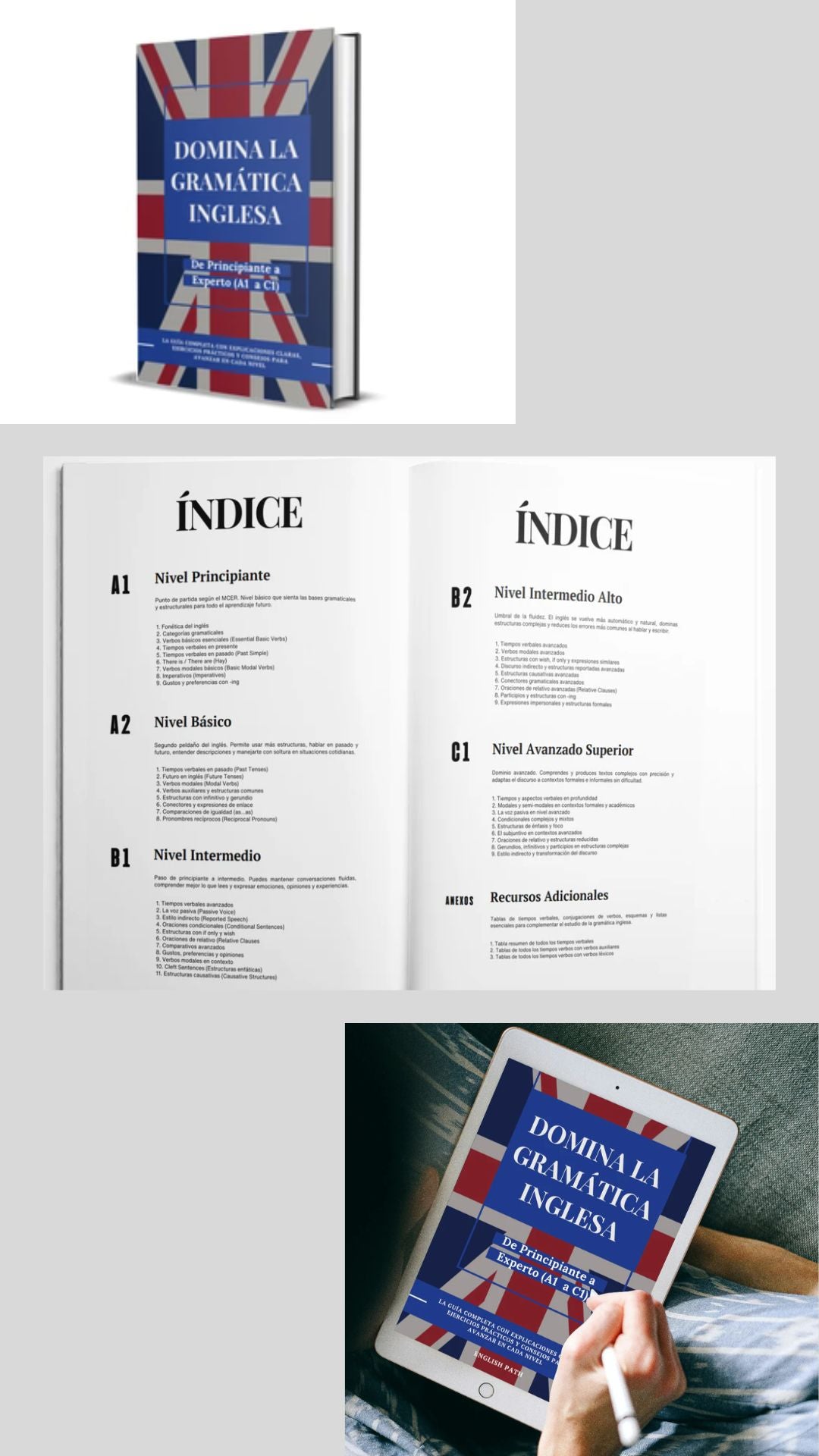 Este libro digital cubre las reglas gramaticales esenciales del inglés, de A1 a C1. Con explicaciones claras, ejemplos y ejercicios, aprenderás a tu propio ritmo. ¡Domina verbos y tiempos verbales! Este eBook es un archivo PDF que puedes descargar o imprimir.
