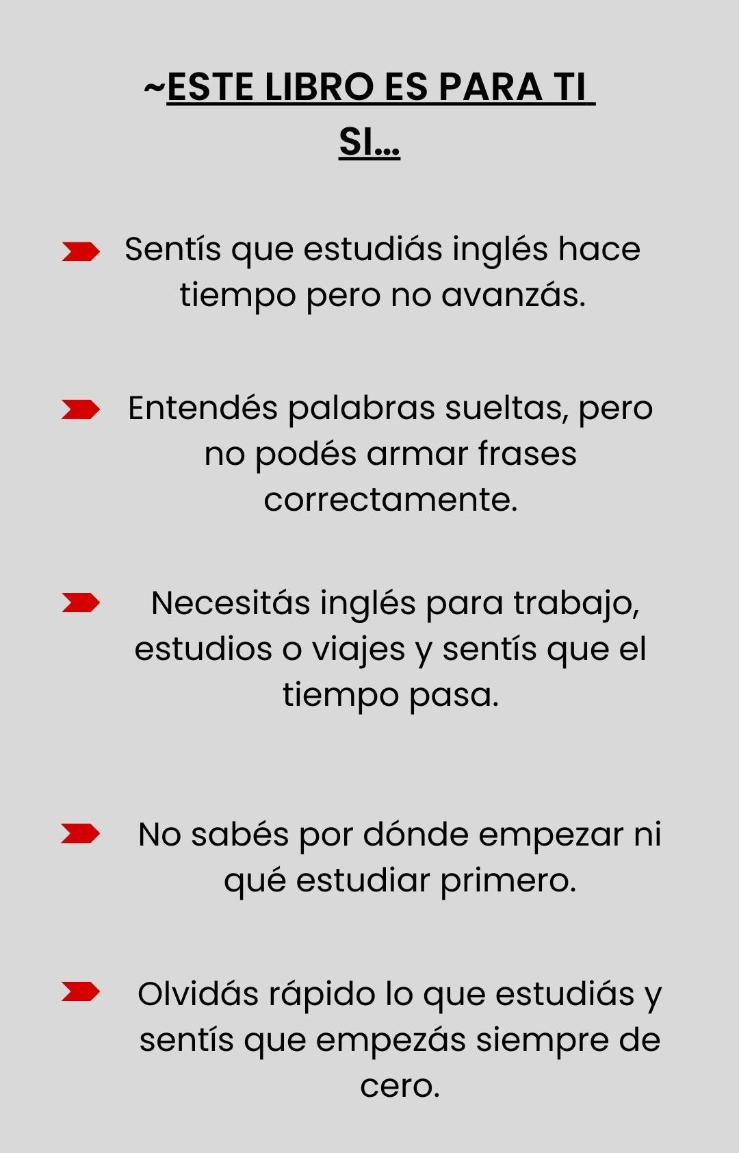 Porque no es solo un libro, es un método claro y probado que te guía paso a paso desde cero hasta dominar el inglés esencial. A diferencia de otros materiales desordenados, este libro te permite aprender con estructura, confianza y a tu propio ritmo, ahorrando tiempo, evitando frustraciones y dándote una herramienta práctica que podés usar de por vida.